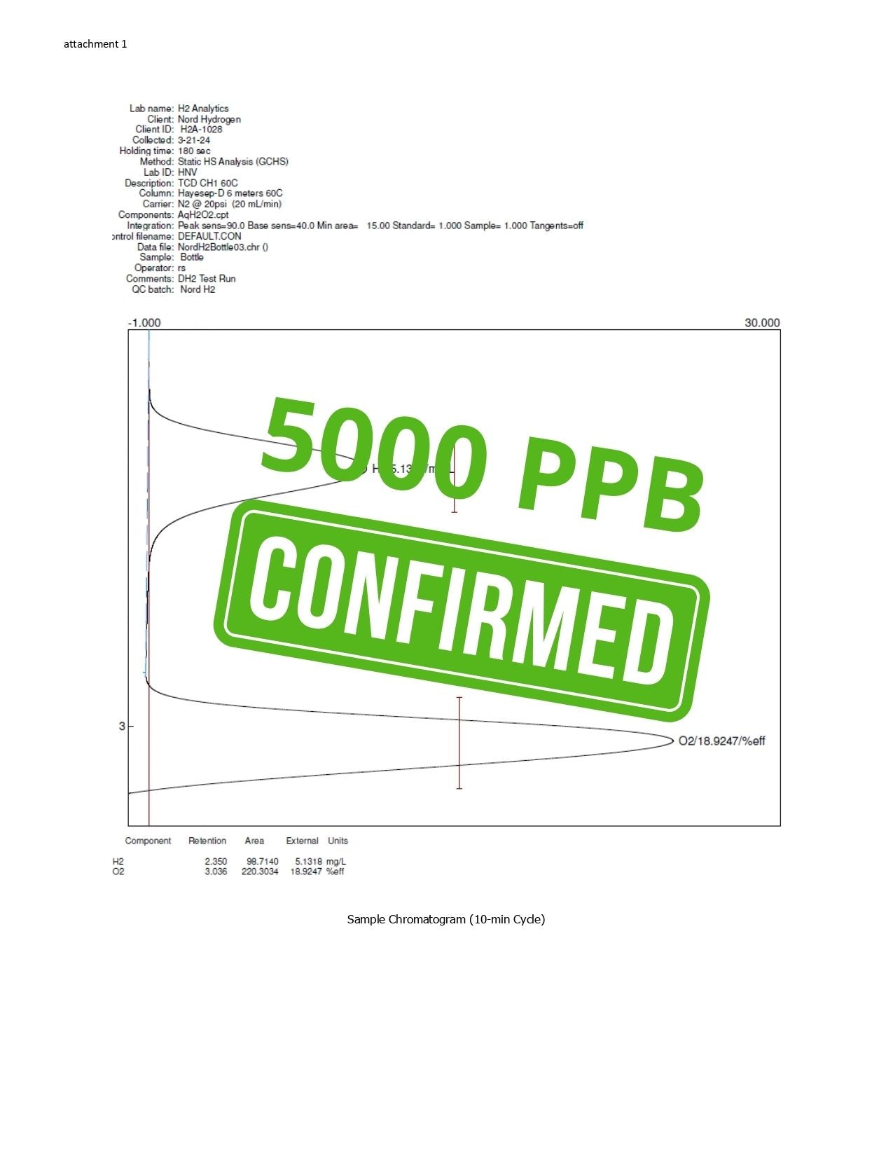 Her ser du en gas-kromatografisk analyse fra H₂ Analytics, hvor vi verificerer koncentrationen af molekylært brint i Nord Hydrogen-flasken. Denne avancerede metode måler præcist, hvor meget H₂ der produceres, og som du kan se i diagrammet – vi når 5000 PPB. Det bekræfter, at flasken leverer et stabilt og sikkert niveau af brint, helt uden uønskede biprodukter som ozon eller fluorid. Videnskabeligt testet, garanteret rent.
