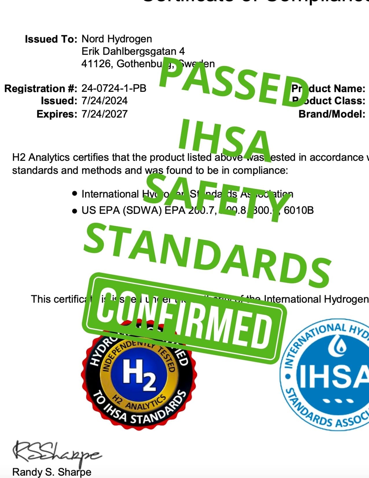 Nord Hydrogen-flasken er godkendt i henhold til IHSA (International Hydrogen Standards Association), en organisation der sikrer, at produkter med molekylært brint opfylder strenge kvalitets- og sikkerhedskrav.