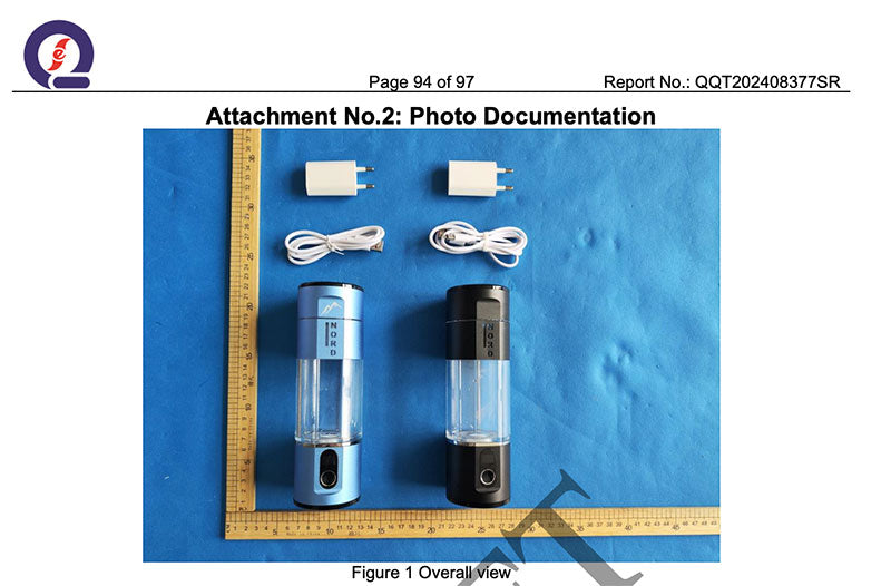 Denne certificering bekræfter, at vores flaske producerer et stabilt og terapeutisk niveau af H₂, uden skadelige biprodukter. En bekræftelse på, at du får et produkt, der er både effektivt og sikkert at bruge.