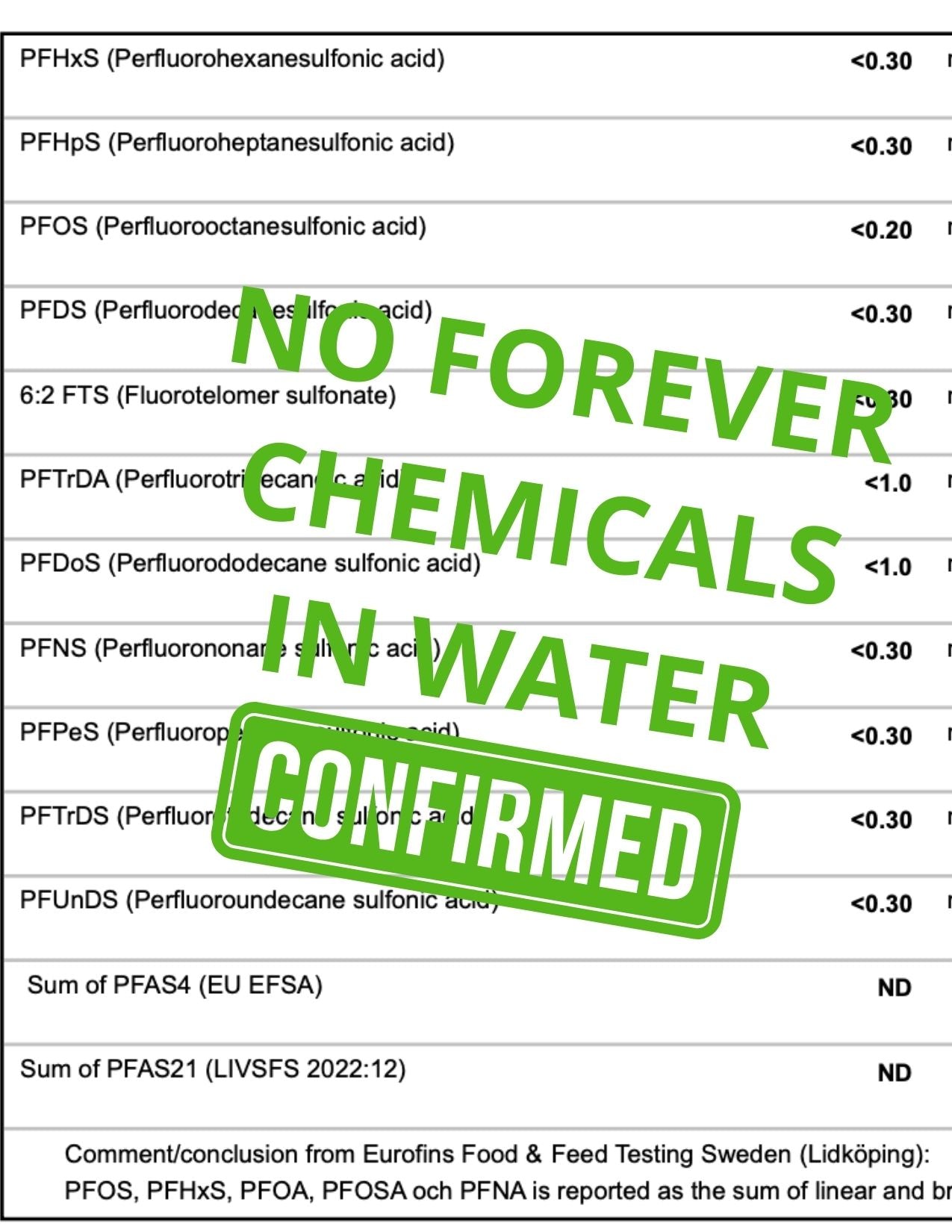 For at sikre, at Nord Hydrogen-flasken giver rent og sikkert vand, lod vi Eurofins udføre en PFAS-analyse. Resultatet? Ingen målbare niveauer af PFAS, de såkaldte "evighedskemikalier". Med andre ord – vandet du drikker er frit for disse skadelige stoffer og opfylder den højst mulige renhedsstandard.